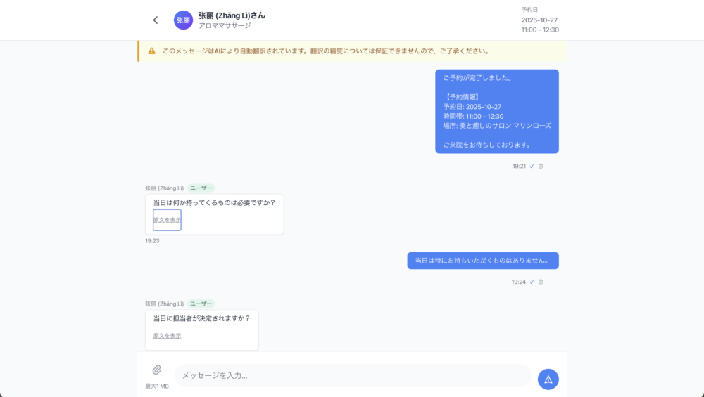 患者と医療機関が直接やり取りできるチャット機能を実装。AIによる双方向自動翻訳で、患者が中国語で質問すればクリニックには日本語で表示されるなど、言語の壁を感じることなくリアルタイムでのコミュニケーションが実現